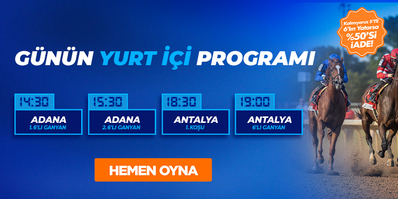 Adana'da 1. 6'lı Ganyan'ın ilk ayağında LA COPA (8)'ya dikkat çekmek istiyorum. Bu isim 3 aylık ara sonrası çıktığı 1900 metrelik son yarışında Black Divine ve Princess Deniz'in arkasında yakın ara 3. oldu. Kısalan mesafenin aleyhine olacağını düşünsem de potansiyeli olan bu ismi yazmadan kupon yapmak istemiyorum. DÜNYA BOŞTUR (6) sürekli istikrarlı koşan bir isim. GİZLİ KAHRAMAN (7) ve TALADRRO (5) düşük bütçeli kuponlarda öncelikli değerlendirilmeli. Geniş kurgularda LAST LEVEL (2) ve KIZIM RABİA (9) göz ardı edilmemeli. Sıralamam: 8-6-7-5-2-9