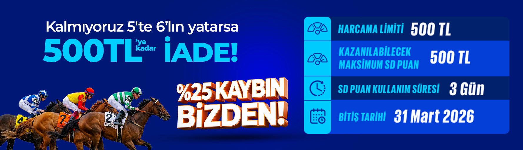 6’lı Ganyan’da kuponun 5’te kalırsa, %25’e varan SD Puan 500 TL üst limit ile seni bekliyor…