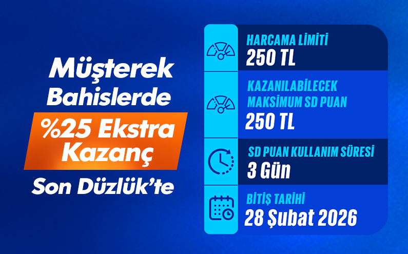 3. Kampanya döneminde oynayacağınız müşterek bahis kupon veya kuponlarınızın kazanması durumunda, net kazancınızın %25’i belirtilen üst limitlerle Son Düzlük hesabınıza SD Puan olarak yüklenir.