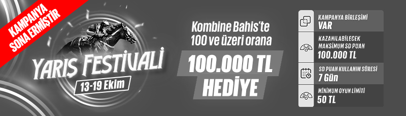 5. Kampanya, Son Düzlük’te yapacağınız tek kuponda, minimum 50 TL değerinde ve toplam oranı en az 100 olan kombine bahis kuponunuzda geçerlidir.