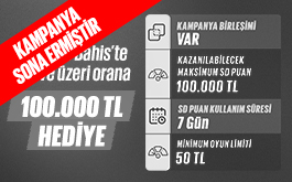 11. Kampanya süresi boyunca birden fazla, minimum 50 TL değerinde, toplamda en az 100 oranlı Kombine Bahis kuponu tutturan kullanıcılar, kampanyadan yalnızca 1 kez pay alabilir.